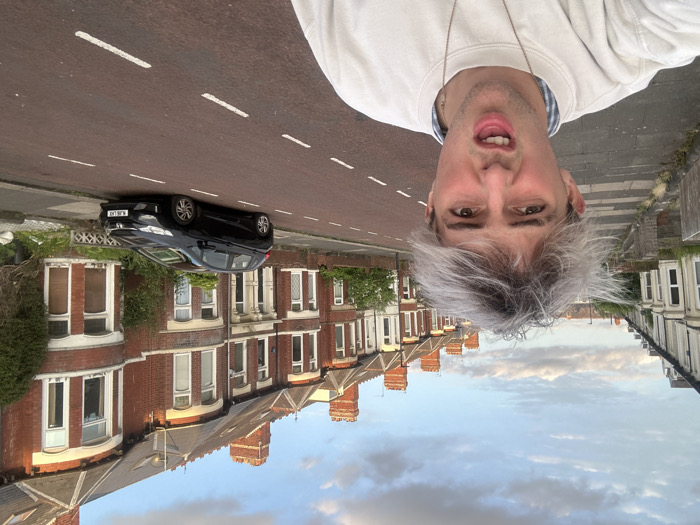 man upside-down in front of a street with brick houses. He is wearing a white sweatshirt and a necklace. A black car is parked on the left side of the street, which has white lines painted on it. The sky is visible between the houses.