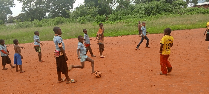 A group of children plays soccer on a dirt field. They are dressed in casual clothing, some wearing brightly colored shirts or patterned fabrics. A boy is in motion, kicking the soccer ball. Lush green foliage and trees form the backdrop, with a building visible in the distance. The scene captures a candid moment of youth and recreation.