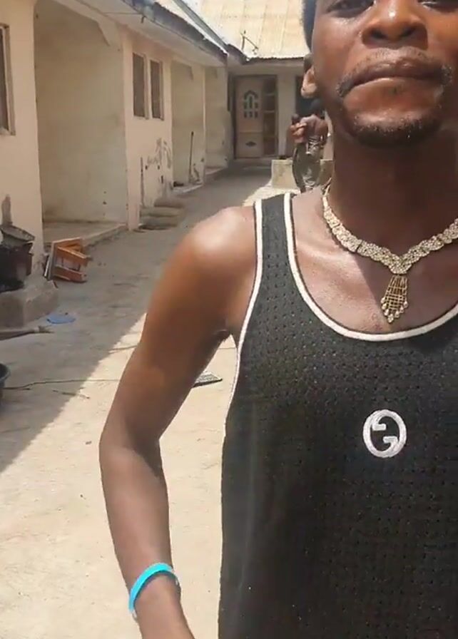 A man in a black tank top with a white trim and a white Gucci logo is standing in a courtyard. The man has a gold-colored necklace and is wearing a turquoise wristband on his left wrist. The man is also wearing a second gold chain with a gold cross on his left wrist. The courtyard has a concrete floor and there is a building behind the man. There is also a black tub and a mortar in the background. The man is smiling and talking. The video is shot in bright sunlight.