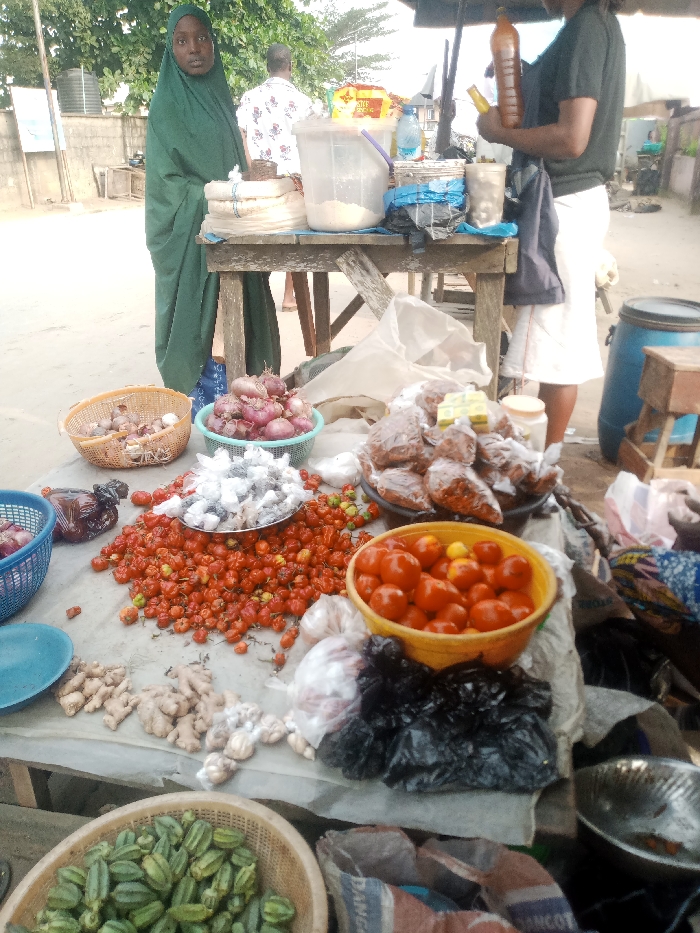 A vibrant outdoor market scene features a woman in a green hijab standing behind a wooden table laden with fresh produce. Tomatoes, peppers, onions, ginger, okra, and other items are arranged in baskets and plates. A customer in a black shirt is holding a bottle. Other figures are seen in the background, adding to the bustling atmosphere. A blue barrel is visible to the right. The scene captures a typical day at a local food market.
