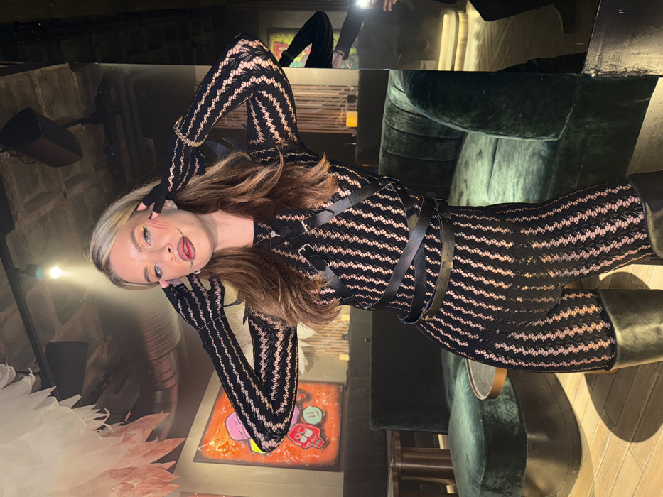 The image depicts a young adult female posing in an upscale, dimly lit interior lounge or bar in Berlin, Germany. **Subject:** A female individual, appearing to be in her twenties or early thirties, stands centrally, facing the camera directly. She has long, wavy, light brown hair with blonde highlights. Her face features cat-like makeup, including extended black eyeliner, drawn black whiskers on her cheeks, and dark lipstick shaped to resemble a feline mouth with a pointed upper lip and extended corners, revealing a pink tongue. She wears a form-fitting, long-sleeved, black and nude-toned patterned (possibly knit or crochet) jumpsuit, which appears somewhat sheer. Over this, she wears a black leather harness-style accessory with straps and buckles, encompassing her torso and waist. Her hands, adorned with fingerless black gloves, are raised to either side of her head near her temples. She wears large silver hoop earrings and a silver pendant necklace with a clear stone. She is also wearing black boots, likely knee-high or thigh-high. Her expression is an open-mouthed gaze towards the camera. **Environment:** The background features dark green velvet upholstered sofas arranged as lounge seating. Small, circular dark tables with metallic bases are positioned in front of the sofas. On the wall behind the seating, a large, rectangular framed artwork with vibrant colors (orange, pink, green, and yellow) depicts stylized faces or skulls in a contemporary art style. The ceiling above is dark, exposing industrial elements such as ducts and a mounted speaker. Large, layered white and pink decorative elements, resembling feathers or petals, hang from the ceiling in the upper left portion of the image. The area is lit by atmospheric, dim lighting, with a prominent spotlight from above illuminating the subject and portions of the ceiling. A reflective surface, likely a mirror or polished panel, on the right side of the image shows a partial reflection of a person holding a smartphone with its flash activated, indicating the image was captured via a reflective surface or a selfie.
