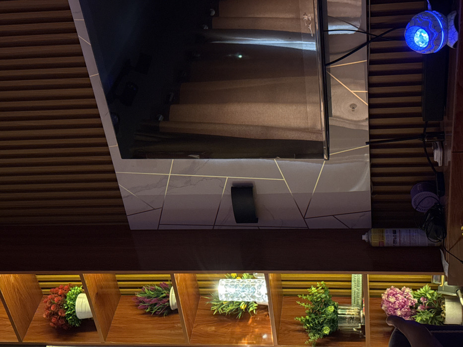 An indoor scene in Oron, Nigeria, depicts a contemporary room, likely an entertainment or living area, illuminated by a mix of ambient and decorative lighting. The primary wall features vertical dark wooden slats, providing a warm, structured backdrop. To the left, a tall, multi-tiered wooden shelving unit, also with a slatted back, holds various artificial potted plants: red and green on the top shelf, purple and green on the second, and pink and green on the bottom. The third shelf contains a white, textured cylindrical lamp emitting bright white light, positioned next to green artificial foliage. A clear glass vase with green foliage occupies the fourth shelf. Adjacent to the shelving unit, a large flat-screen television is positioned against a panel featuring a white marble-like pattern with thin gold geometric lines. A black, semi-cylindrical wall sconce is mounted on this patterned panel. The television screen reflects interior elements, including beige curtains and possibly recessed lighting, with a faint green light dot visible on its surface. Below the television, a wooden entertainment console holds several items. From left to right, a white aerosol can with legible text is visible. Further right are a dark electronic device, coiled black cables, a purple circular object (possibly a small fan or diffuser), a small black antenna, and a stack of small white rectangular objects. On the far right, a white, textured orb-shaped decorative lamp emits a blue light. A dark-skinned human hand is partially visible in the bottom-left corner of the image, near the lowest shelf.
