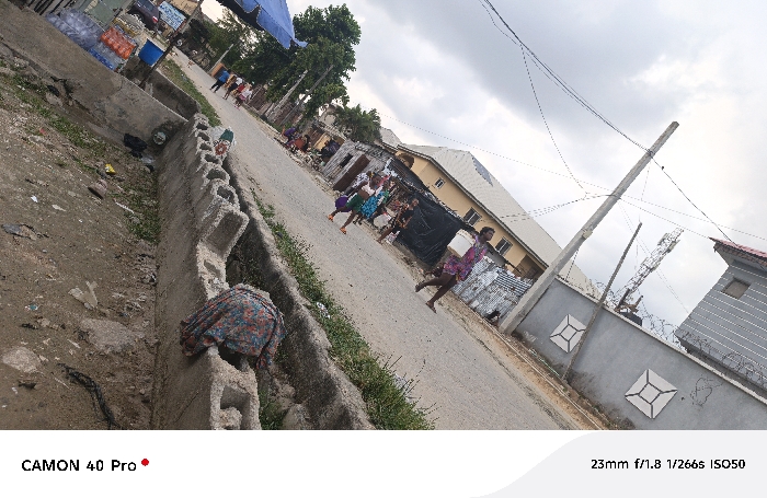 The image depicts a tilted, wide-angle view of a street in the city of Ado, Nigeria, under an overcast sky. In the foreground on the left, a dirt path contains scattered refuse. Parallel to this path runs a concrete drainage ditch, its inner wall constructed from stacked concrete blocks. A crumpled, multi-colored fabric item rests inside the ditch. Adjacent to the ditch is a paved road where multiple pedestrians are observed. On the right side of the road, a person wearing a pink and white patterned garment walks, carrying a white bucket in their right hand. Further up the road, another person in a blue and green patterned dress is visible. Towards the left of the road in the background, a vendor's stall with bottled goods is present under a blue tarp awning. On the right side of the image, a gray concrete perimeter wall features two white, square, geometric relief patterns and is topped with barbed wire. Behind this wall stands a multi-story building with a light-yellow facade, multiple windows, and what appear to be solar panels on its roof. A tall utility pole with numerous overhead power lines dominates the right side of the frame, with a metal telecommunications tower partially visible behind it. Various other structures, some appearing to have corrugated metal elements, line the street in the background. Sparse green vegetation is visible along the ditch and near some background buildings.