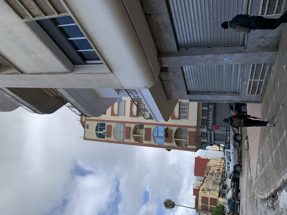 This image depicts an urban street scene in Meknes, Morocco, specifically in the vicinity of Avenue Moulay Ismail and Rue de Beyrouth/Avenue Mohammed VI. The scene is observed on an overcast day. In the immediate foreground on the right, a multi-story building with a light-colored, possibly cream or beige, facade and a distinctive curved corner is prominent. Its ground floor features two closed commercial storefronts, each secured by a gray, horizontally corrugated metal roll-down shutter. The upper floors of this building display curved balconies with dark railings and rectangular windows. On the paved sidewalk in the foreground, two individuals are visible. One individual, seen from behind, walks away from the camera towards the left mid-ground. This person wears a dark jacket, dark pants, light-colored shoes, and a dark green beanie, and carries a dark, slender object, possibly a folded umbrella, in their right hand, with a backpack on their shoulders. Further ahead on the right sidewalk, a second individual, also viewed from behind, walks towards the right, wearing a dark jacket and a dark beanie, holding an object in both hands at waist height. To the left of the sidewalk, a street is lined with parked vehicles, including a silver pickup truck, dark sedans, and other cars. Dominating the mid-ground on the left is a tall, slender multi-story building, primarily yellow with red architectural accents around its balconies. This building features a mix of window types, including distinctive light blue reflective arched windows and standard rectangular windows. The ground floor of this building prominently displays a green sign with "PHARMACIE" in white French lettering, and a smaller, similar sign below it. In the background, further down the street, additional multi-story urban buildings of varying colors and styles are visible. A single palm tree stands on the far left. The sky overhead is largely cloudy with patches of lighter sky visible.