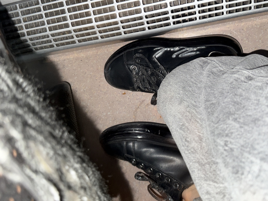 The image presents a top-down view of an individual's lower legs and feet on a light brown tiled floor in the city of Vrachesh, Bulgaria. The subject wears light-wash denim jeans. Both feet are shod in black, shiny shoes with thick black soles. The left shoe is a high-top or boot with black laces threaded through eyelets. The right shoe is a low-top sneaker featuring black, possibly metallic or glittery, laces and a silver-colored, stylized 'W' emblem on its lateral side. To the upper left, a blurred, dark, textured object, possibly upholstery, is partially visible. To the upper right, a grey rectangular object with a grid pattern, consistent with a ventilation grate, is present and appears to have accumulated dust.