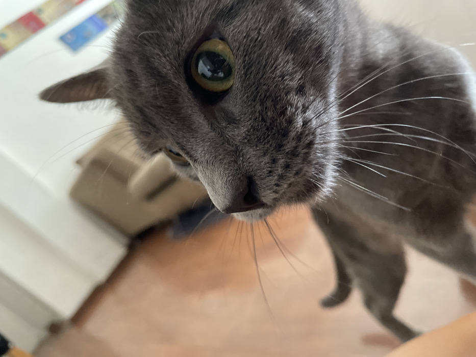 - "The image presents a detailed, low-angle view of a grey domestic cat indoors" by FM-BT1Sm1, licensed under CC BY 4.0