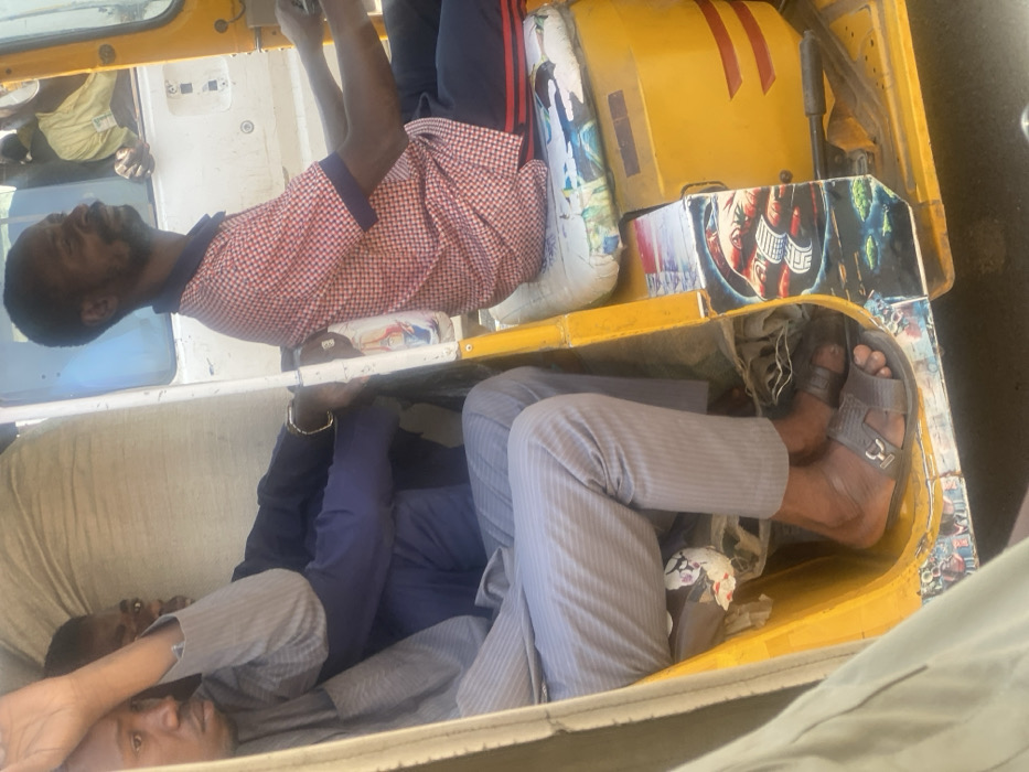Within the city of Bachirawa, Nigeria, an image captures the interior and immediate surroundings of a yellow, three-wheeled auto-rickshaw during daylight hours. The vehicle contains three adult male occupants and cargo. The driver, a dark-skinned male with a beard and short dark hair, is seated on the right, wearing a red and white checkered short-sleeved collared shirt with blue trim and dark pants. He is positioned at the controls, looking to his right, out of frame. His seat cushion is white and patterned, with a religious image of a woman visible on the backrest. Behind the driver, a dark-skinned male passenger is seated to the left, wearing a light grey striped long-sleeved shirt and matching pants, with grey sandals on his feet. His left arm is raised and bent, resting against an unseen upper frame or cargo. His gaze is directed forward. Discarded white and red material is visible on the floor near his feet. A second dark-skinned male passenger is partially visible, seated behind the first passenger and to his left. He wears a dark blue long-sleeved shirt and dark blue pants, with a gold-colored bracelet on his left wrist. Much of his upper body is obscured by a large, light-colored sack positioned as cargo in the rear compartment. The auto-rickshaw's interior features decorative elements, including a decal of a red fist wearing rings on the lower right-side panel. A white vehicle with a partially visible person in a yellow shirt is present in the background, seen through the driver's side window.