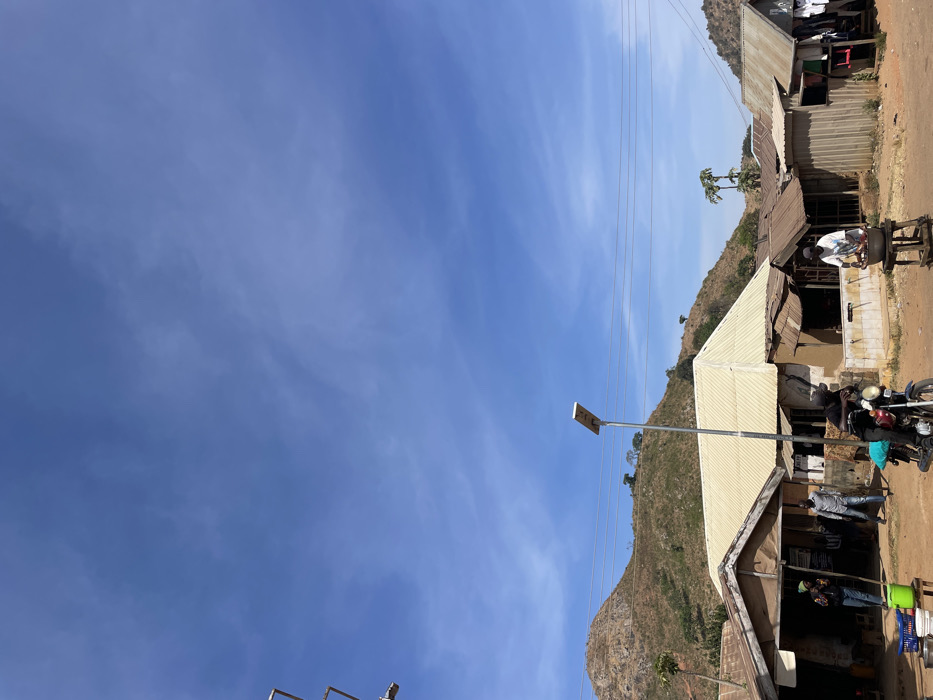 The image depicts an outdoor daytime scene in the city of Unknown, Unknown, under a clear blue sky with sparse, wispy clouds. Prominent dry, brush-covered hills form the background. In the mid-ground, a dirt path or road fronts a series of one-story structures. The central structure features a light-colored corrugated metal roof and mud-rendered walls, with a dark doorway and partially visible individuals inside. To its right, other structures with weathered, corrugated metal roofs and walls are visible, some with clothes hanging to dry. A tall, silver-colored metal pole with an integrated solar panel and street light head stands centrally in front of the structures, with multiple horizontal utility lines traversing the upper mid-ground. Another partial street light pole is visible on the far left. In the foreground-center, a man wearing a dark shirt and dark cap is seated on a red motorcycle, which has a blue bundle secured to its rear. To his right, a man in a white shirt and dark pants stands, actively tending to a large, dark metal pot resting on a low, rustic wooden stand, suggesting outdoor cooking. Near the entrance of the left-most building, a person in a patterned shirt stands by a green table-like object with blue and white containers, while another man in a light grey shirt stands upright nearby. The scene conveys active daily life in a semi-urban or rural setting.