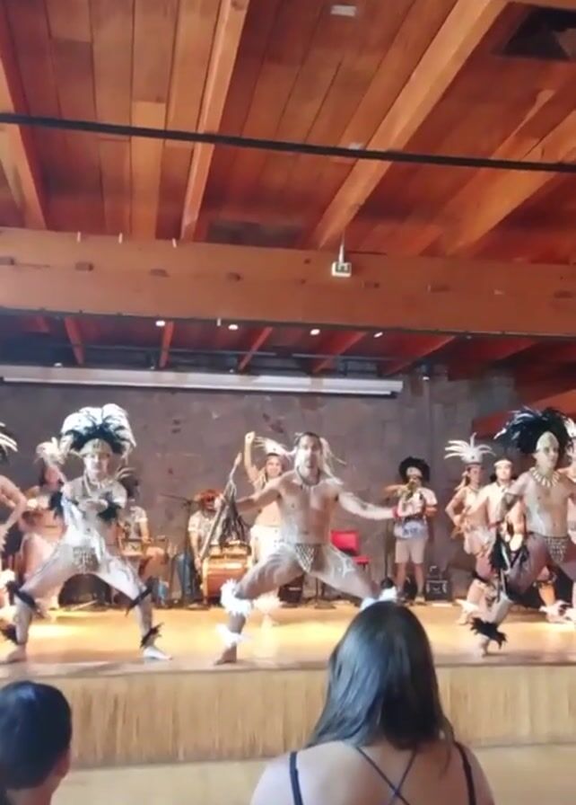 A mid-shot video shows a group of people performing a tribal dance on a stage. The stage is wooden and is set against a stone wall. In the background, a group of musicians is visible, playing instruments such as drums, guitars, and an accordion. The dancers, mostly shirtless men, are wearing white tribal costumes with feathered headdresses and ankle decorations. Their bodies are painted with white designs. They are performing energetic dance moves, with some holding wooden spears. The audience is partially visible in the foreground, mainly the backs of their heads. The room has a wooden ceiling and is well-lit. The camera is mostly static, but there is some slight movement and zooming in on the dancers.