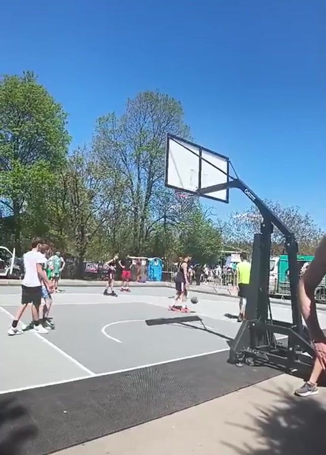 n outdoor basketball court on a bright, sunny day with a clear blue sky. A group of people are on and around the court, and some are actively playing basketball. The court is gray with white lines marking the boundaries and key areas. A portable basketball hoop stands at one end, with a black base and support structure. Trees surround the area, suggesting a park-like setting. People are seen watching the game, and in the background, there are vehicles and structures, possibly indicating a public event or gathering. The camera is positioned slightly off the court, providing a view of the action from the sidelines.