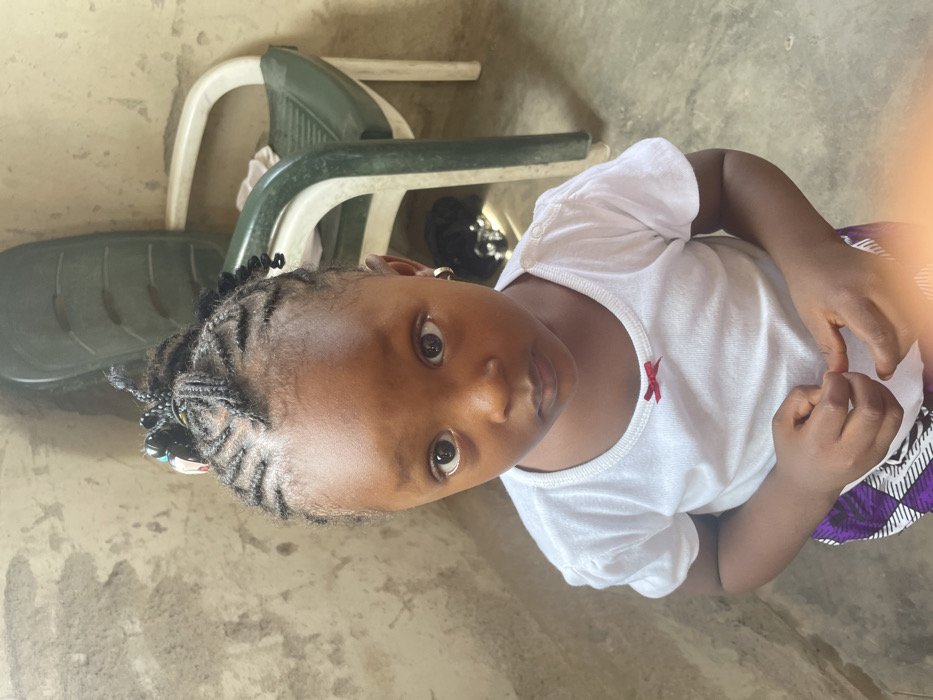 A young, dark-skinned child looks up at the camera. She wears a white, short-sleeved shirt with a small, red bow detail. Her hair is styled in neat braids with colorful beads at the ends. The child is standing on a textured, light-colored floor. Behind her are two stacked green and white plastic chairs. Part of a patterned purple and white skirt is visible.
