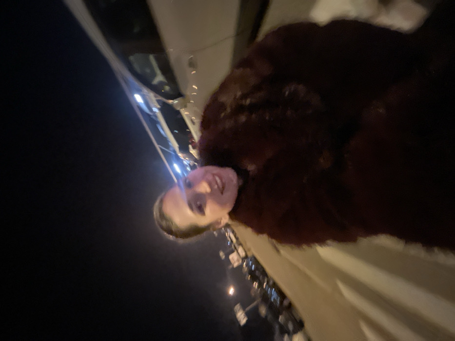 A person in a maroon fur coat smiles, standing outside at night. Streetlights are visible in the background. A vehicle, possibly a car, is partially seen behind the person. The image is oriented at an angle. The setting appears to be urban, with a dark sky contrasting with the artificial lights.