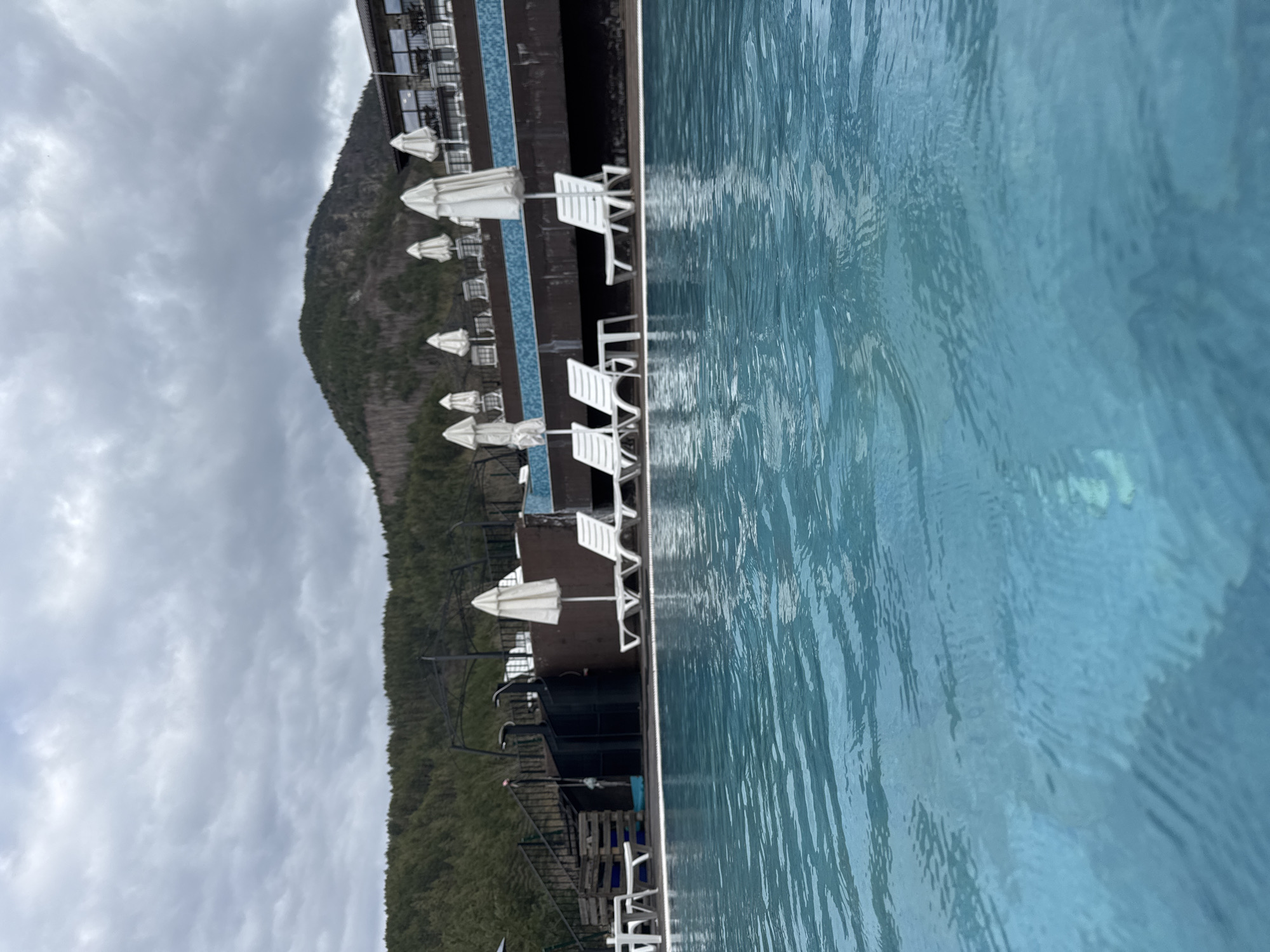 The image captures an outdoor swimming pool area in Sapareva Banya, Bulgaria, under an overcast sky. The foreground is dominated by the rippling, blue-green water of a swimming pool. Along the immediate pool edge, a dark-colored wooden deck features several unoccupied white plastic lounge chairs. Some chairs are paired with closed white patio umbrellas. To the far left, a white table and chairs are partially visible. Behind the pool deck, a dark-paneled structure, adorned with blue mosaic tiles, rises, supporting additional seating areas with more white umbrellas and lounge chairs at a higher elevation. Further left, a dark metal staircase with railings ascends, adjacent to several dark cylindrical containers and wooden crates. The background consists of densely forested mountains under a thick layer of grey clouds. On the far right, a building with multiple large windows and balconies, suggestive of a hotel or resort, is visible against the hillside. No individuals are present in the scene.