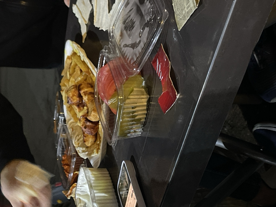 The image displays a close-up, dimly lit view of a dark-colored table set with food items, consistent with a casual meal being consumed in Homs, Syria. In the upper left, a person's hand, clad in a dark long-sleeved garment, is seen holding and manipulating a piece of flatbread. The central object is an oval white plate containing several pieces of grilled or fried chicken, likely shawarma or skewers, served with numerous french fries and resting on flatbread. To the left of this dish, a white rectangular plastic container holds a creamy white dip. Further back, two clear plastic containers with hinged lids contain distinct sauces: one reddish, and another darker in color. To the right of the main dish, a clear plastic container with a partially open lid contains sliced red tomatoes and green pickles. Scattered on the dark table surface are several torn pieces of flatbread and a crumpled red and white wrapper. A dark-cased smartphone with a light-colored object placed on its screen is visible on the table in the lower-left quadrant. Below the table, two pairs of feet in dark footwear (a blue sneaker and a dark slip-on shoe) are discernible, indicating the presence of at least two individuals. The overall lighting suggests a nighttime or low-light environment.