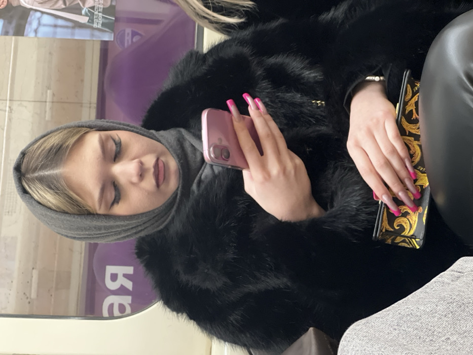 A young woman with long, pink manicured nails is seated, seemingly dozing with her eyes closed. She wears a dark, fur-like coat and a gray headscarf. She holds a pink smartphone in one hand and rests the other on a black and gold patterned clutch. The scene appears to be set in public transportation, possibly a train or bus, as suggested by the window and seating visible in the background. A promotional poster or ad is visible in the upper-left corner.