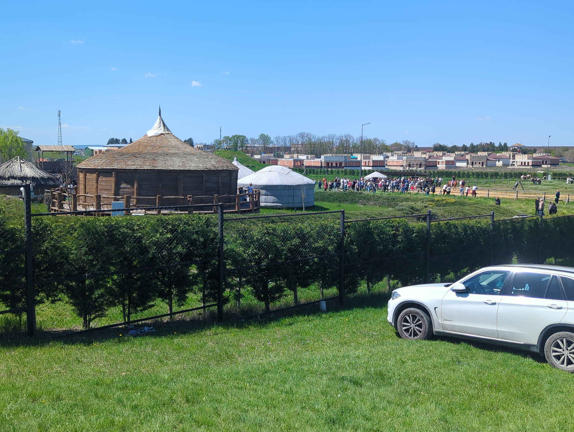 The image depicts a grassy field in the city of Neofit Rilski, Bulgaria, with a white SUV parked on the right side. A dark metal fence runs across the midground, with a row of dense green bushes behind it. Beyond the fence, there's a collection of structures including a circular wooden building with a conical roof, a yurt-like tent, and other buildings resembling a historical settlement or attraction. A crowd of people is gathered in the distance, and there are some horses and riders visible beyond them. The sky is clear and blue.
