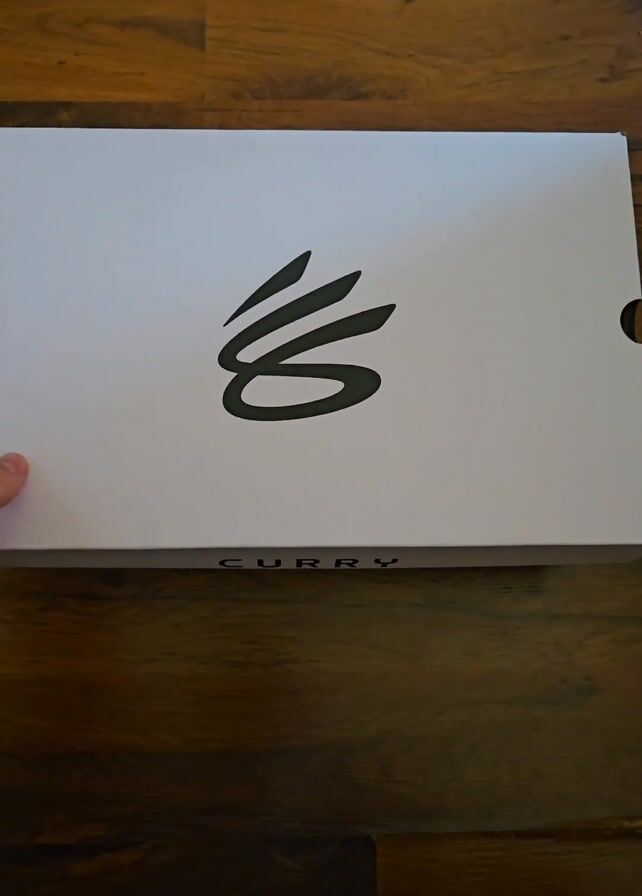 A hand opens a white shoe box with a Curry logo on top. Inside, the shoes are wrapped in tissue paper that is printed with the word "CURRY" and the Curry logo.