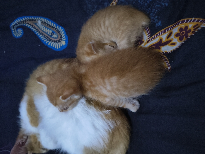 - "Three ginger kittens huddle together on a dark, patterned fabric" by FM-6v3fB3, licensed under CC BY 4.0