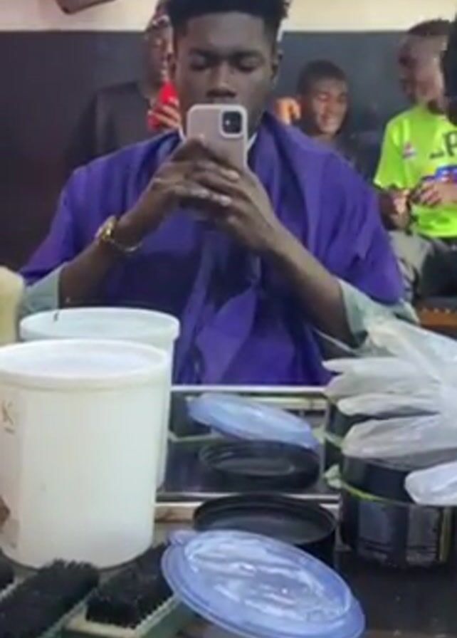 A young, dark-skinned man in a purple barber cape takes a selfie in a barber shop mirror. He holds a phone in both hands and looks down at the screen. Behind him, three young men sit and wait. The barbershop has white walls. A shelf behind the man shows a hanging purse and a plant. On the counter in front of him are two large white buckets, multiple small containers of product, and two hairbrushes.