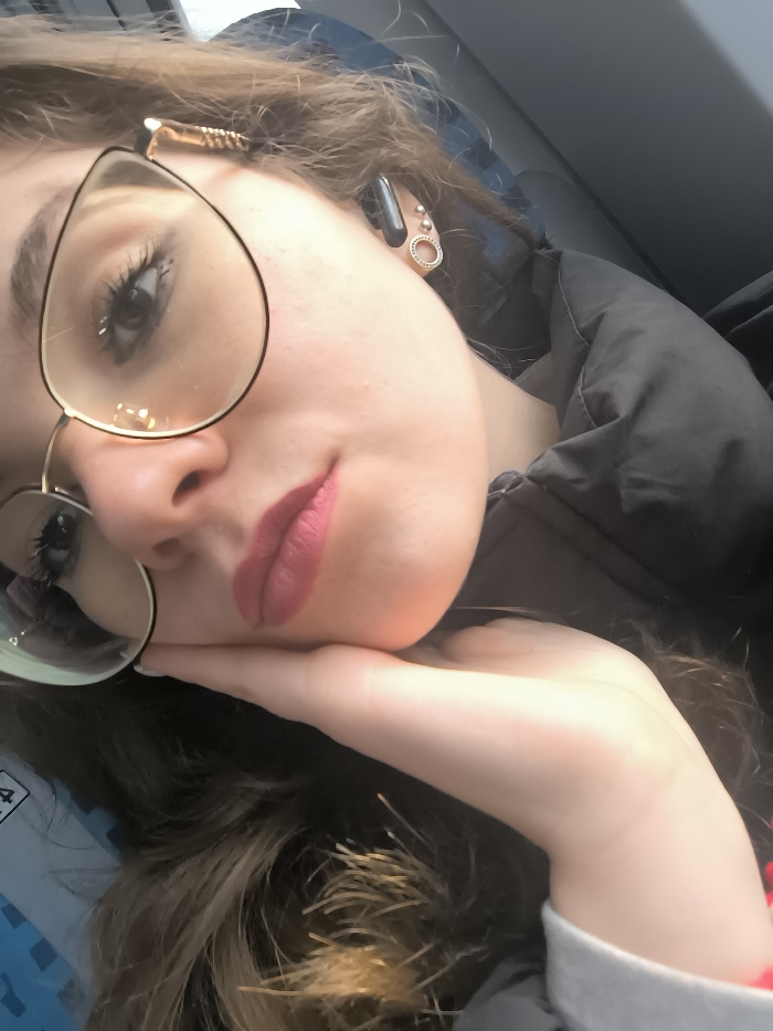 The scene is described as being in Kopanitsa, Bulgaria; however, the image itself does not contain visual identifiers to confirm this specific geographical location. The photograph captures a close-up, angled portrait of a single individual, appearing to be female, positioned in an interior setting, likely a vehicle such as a bus or train, indicated by a blurred blue patterned fabric in the lower left background, possibly a seat cover. The individual has long, dark brown hair and fair skin. She wears large, gold-framed, possibly cat-eye style eyeglasses, which reflect ambient light. Her right eye is visible, featuring mascara-applied eyelashes. Her lips are coated with pinkish-red lipstick. The individual's right ear is visible, adorned with multiple piercings: a single black bar-shaped stud, two smaller silver-toned stud earrings, and a gold-toned open circular hoop earring. Her right hand, with manicured fingernails, supports her chin or jawline. She is wearing a dark, possibly padded or quilted, jacket, with a visible white cuff of an underlying garment on her right wrist. The individual is looking directly towards the camera. The background is uniformly out of focus, suggesting a shallow depth of field.