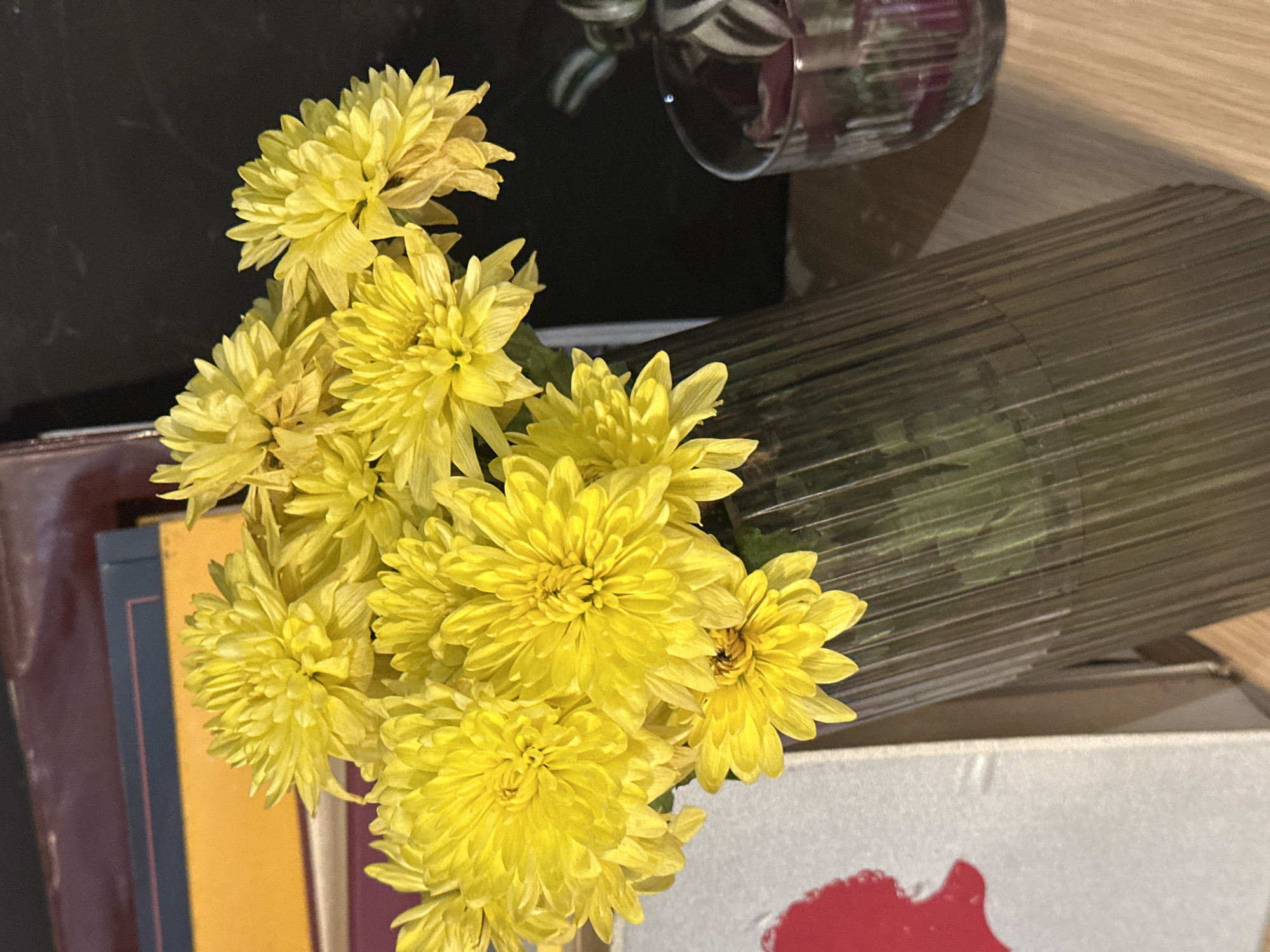 A bouquet of yellow chrysanthemums fills the foreground, arranged in a vertically-ridged glass vase