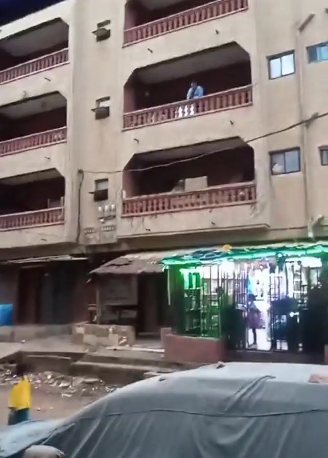 The scene captures a street view with a multi-story building in the background, likely an apartment or commercial building, with balconies on each level. A person is visible standing on one of the balconies. In the foreground, a car is covered with a gray tarp. A child wearing a yellow shirt is walking on the street toward the left side of the frame. Debris and trash are scattered on the street, indicating a somewhat rundown or neglected urban environment. Several storefronts are visible on the ground floor of the building, some with protective metal bars or shutters. The lighting suggests an overcast day.