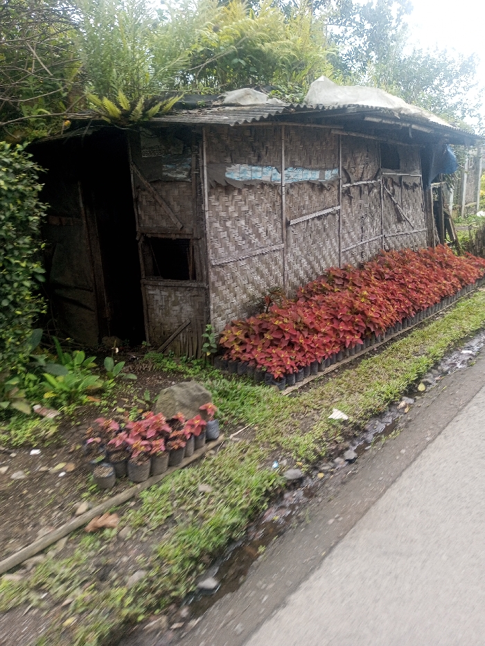 The image captures an outdoor scene in Sarwahi Mal., India, featuring a single-story, dilapidated structure constructed from woven bamboo-like material, exhibiting damage with exposed blue underlayment in sections. The roof is made of corrugated metal sheets, partially covered with green vegetation including ferns, and secured by two light-colored, possibly tarp-wrapped, objects. An open, dark doorway and a small rectangular opening are visible on the left side of the building. Dense green foliage envelops the left side of the structure and extends into the background. A prominent feature is a long, linear arrangement of numerous small, dark-potted plants, primarily displaying red and reddish-purple leaves, positioned parallel to the structure. A smaller cluster of similar potted plants is located in the foreground, next to a large, dark gray rock. The ground comprises bare soil, sparse green grass, and a narrow, water-filled channel running parallel to a gray paved road that occupies the lower right portion of the frame. No individuals are present in the scene.
