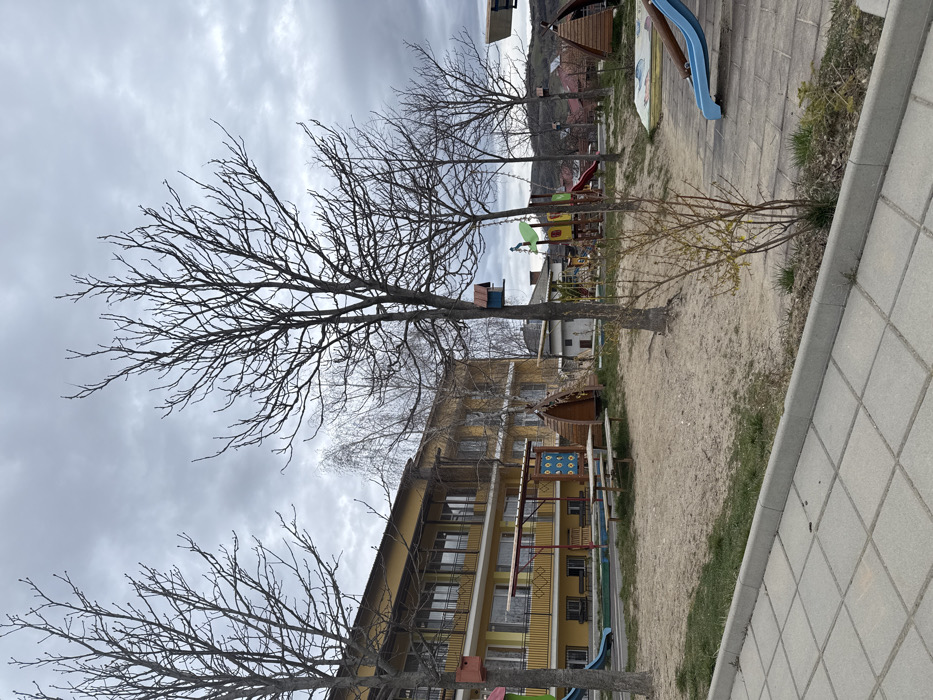 The scene depicts an unoccupied outdoor playground in Breznitsa, Bulgaria, viewed under an overcast sky. The foreground consists of grey square paving stones, transitioning into a sandy, light brown ground with sporadic patches of sparse green grass. To the left, a multi-story building with a yellow facade features numerous windows, balconies with yellow railings, and protective awnings above lower-level windows. Several bare deciduous trees, indicative of late winter or early spring, are positioned throughout the sandy area; some feature attached birdhouses. Playground equipment includes, from left to right: a blue slide, a wooden picnic table with benches, a vertical activity panel with colorful blue, red, and yellow elements, and multiple wooden A-frame structures. Further right, a larger multi-colored play structure (green, yellow, red) with an attached red slide is visible, alongside another blue slide and additional small wooden hut-like structures. A small, multi-branched shrub with developing yellowish leaves stands in the right foreground. Residential buildings and distant hills are visible on the horizon to the right. No individuals are present in the scene.