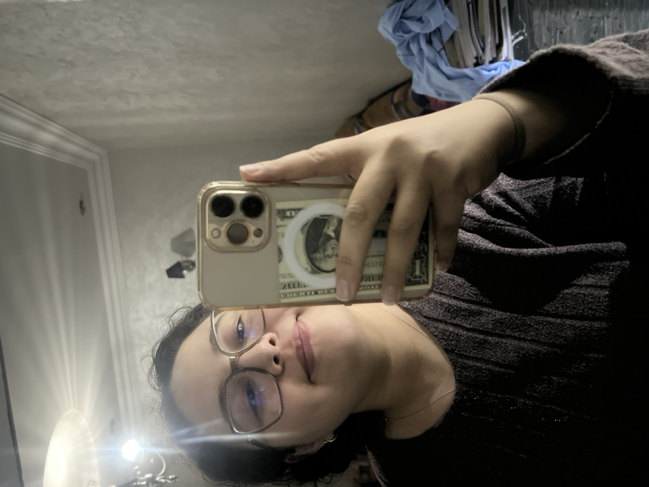 A person wearing glasses and a dark sweater is taking a selfie in a mirror. The phone case is beige and features a design resembling a one-dollar bill and a ring light. A blurred light fixture and ornate white molding are visible in the background, along with some clothes hanging. The mirror's surface reflects the room's lighting.