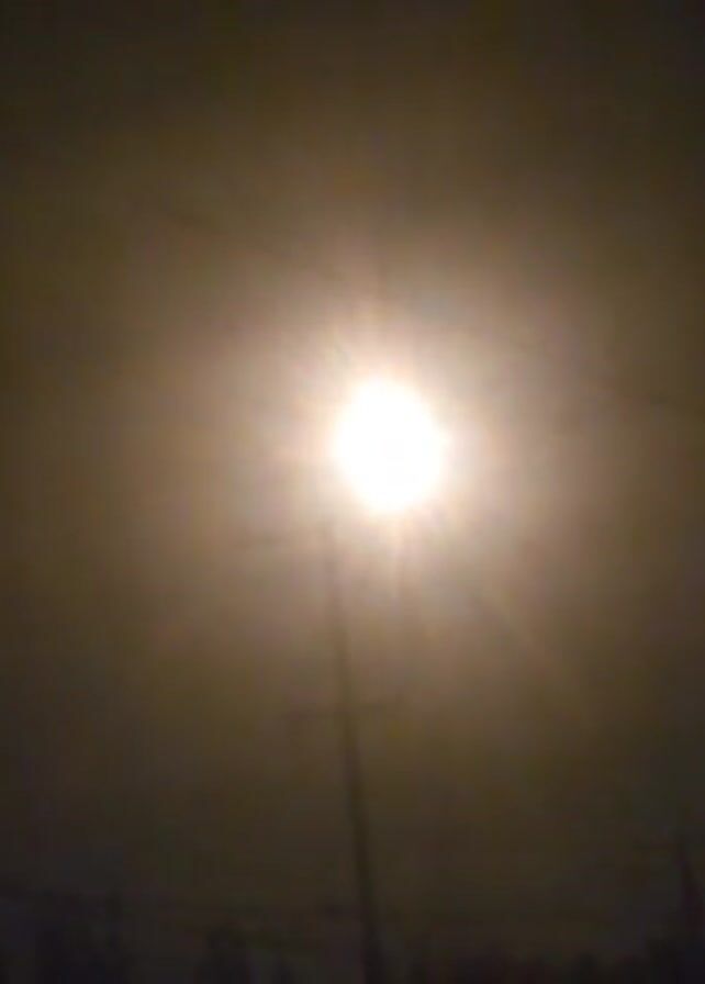 low-angle view looking up at a bright streetlight at night. Power lines are visible stretching away from the light. Below, at the bottom of the frame, there are faint silhouettes of trees or bushes. The scene is dark overall, with the streetlight being the primary source of illumination.