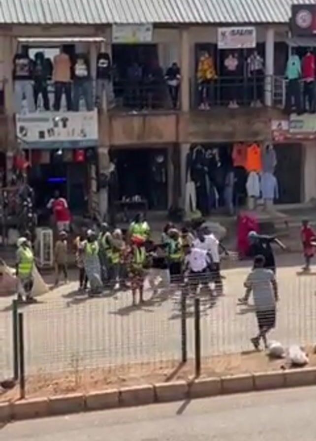 group of people, some wearing neon yellow vests, dancing in a street. There is a two-story building behind them with several stores, some displaying clothing on mannequins. People are standing on the balconies of the building, watching the dancers. A fence runs along the street in front of the camera's perspective. The ground is covered in dirt.