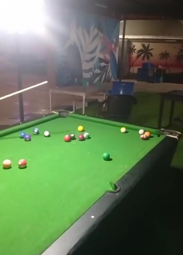 pool table with balls scattered across its green surface. A pool cue rests near the balls on the left side of the table. The table has black edging with metal corner protectors. Above the table is a bright light, and in the background, there is a white table and chairs, with a wall featuring a blue and white design resembling leaves. Further back, there is another wall with a mural of palm trees. The overall environment appears to be a recreational or bar area.