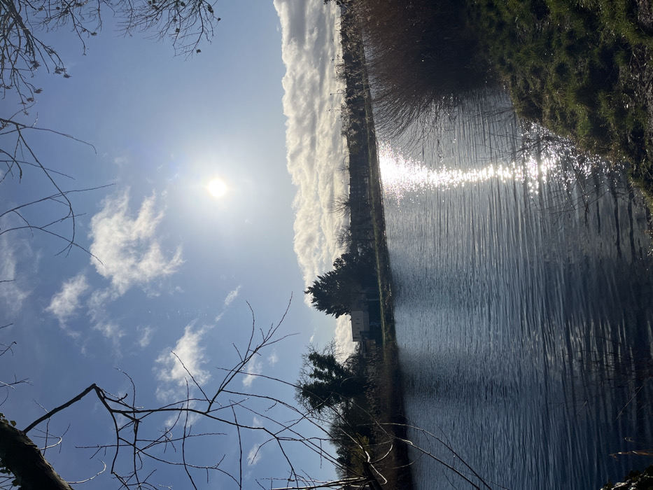 A river or canal reflecting sunlight stretches vertically through the frame. Grass and reeds line the right bank, while trees and a building are visible on the left. Bare branches frame the lower left corner. A bright sun shines in a blue sky scattered with white clouds, positioned diagonally above the river. The image is slightly tilted, creating a dynamic, off-kilter perspective.