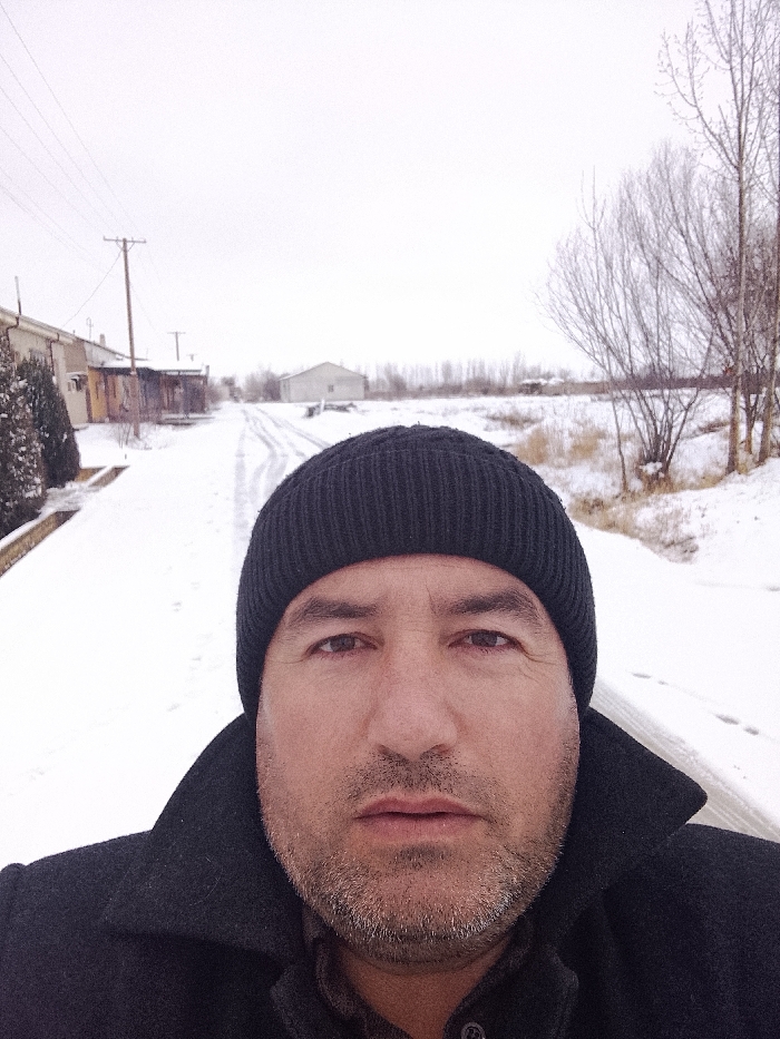 A man in a black beanie and dark coat takes a selfie in a snowy landscape. A snow-covered road stretches into the distance, flanked by buildings on one side and bare trees on the other. The sky is overcast. Power lines run alongside the road. The man's face is the central focus, revealing a light beard and serious expression. Snow covers the ground, suggesting a cold environment.