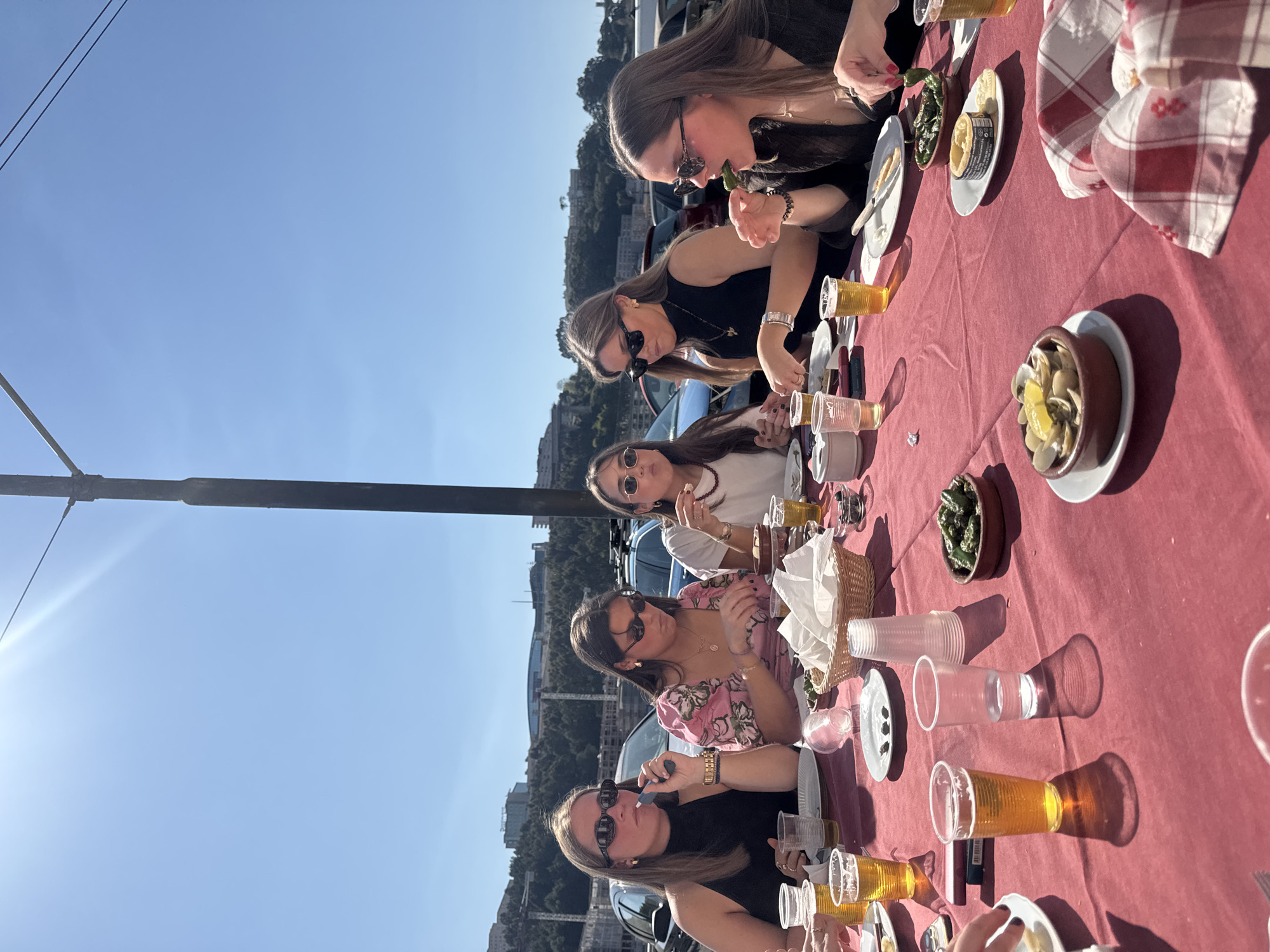 An outdoor dining scene in Porto, Portugal, takes place under a clear blue sky on a bright, sunny day. Five young adult females are seated around a long, rectangular table covered with a dark red tablecloth. All individuals are wearing sunglasses. From left to right: 1. A woman in a black halter-neck top is holding a light blue vape pen to her mouth. 2. A woman in a pink floral-patterned blouse is looking down, with her hands near a plate. 3. A woman in a white t-shirt is partially visible, appearing to eat. 4. A woman in a black top is looking towards the right side of the frame. 5. A woman in a black top is actively eating a green pepper. The table is extensively covered with numerous clear plastic cups, several containing a golden-yellow liquid resembling beer, and others containing water. White paper plates, some containing food residue, are present. Small brown ceramic bowls hold appetizers, specifically green peppers and clams topped with a lemon wedge. A small tin of preserved fish (e.g., sardines) rests on a white plate alongside a white spread. A woven basket filled with white paper napkins is also on the table. A cigarette pack is visible near a cup. The sun is high, casting distinct shadows from the cups and objects onto the tablecloth. A tall, dark utility pole stands prominently behind the table, slightly right of center. In the background, a steep, tree-covered hillside rises, dotted with numerous buildings and visible construction or civil engineering infrastructure. Several parked cars, including black and light blue vehicles, are visible on a paved surface behind the diners. The scene is consistent with an eatery located along the Douro River, possibly near Cais da Ribeira or Vila Nova de Gaia, given the characteristic hillside urban development.