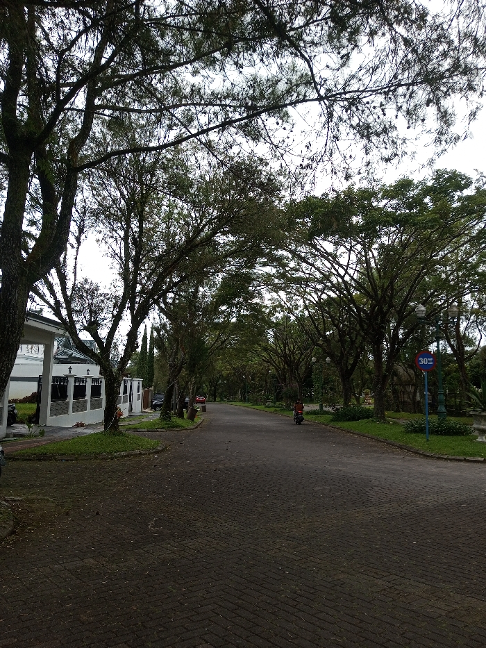 A quiet asphalt road stretches under a canopy of tall trees, their branches intertwining overhead. A scooter moves along the road towards the distance. A white house stands to the left, while manicured greenery lines the road's sides. A speed limit sign marks the right side. The sky is overcast.