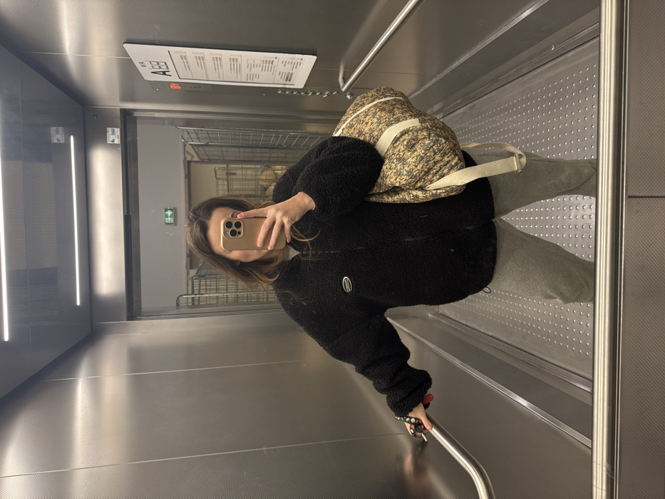 A woman stands in an elevator, taking a selfie with her phone. She wears a black fleece jacket, grey sweatpants, and carries a patterned bag over her shoulder. The elevator features stainless steel walls and a metal railing. There's an information sign mounted on the wall, and a glimpse of a hallway with carts can be seen through the open elevator door.