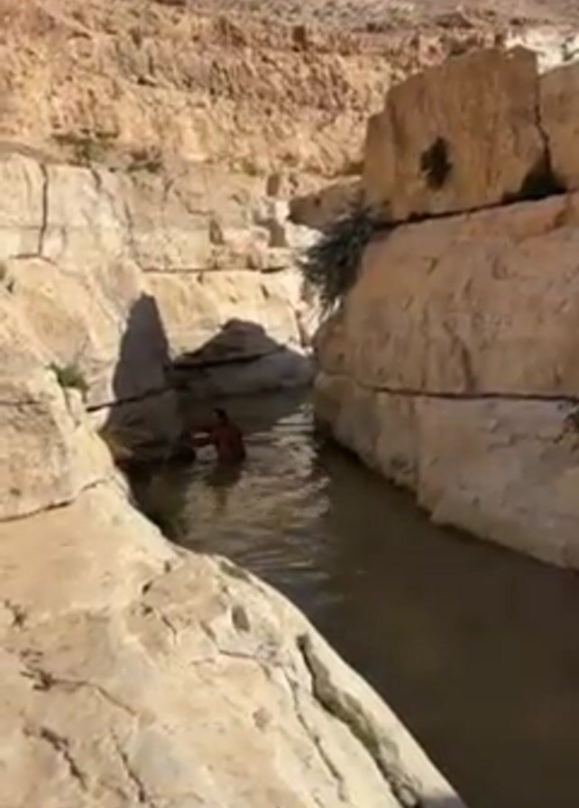 person standing in a narrow body of water between tall, light-colored rock formations. The water is a murky color, and the person is positioned in the middle of the stream, with their arms outstretched, touching the rock walls on either side. The person is a man, and he is shirtless. The surrounding environment is arid, with minimal vegetation clinging to the rock faces. The sky above is visible and clear, suggesting a sunny day.