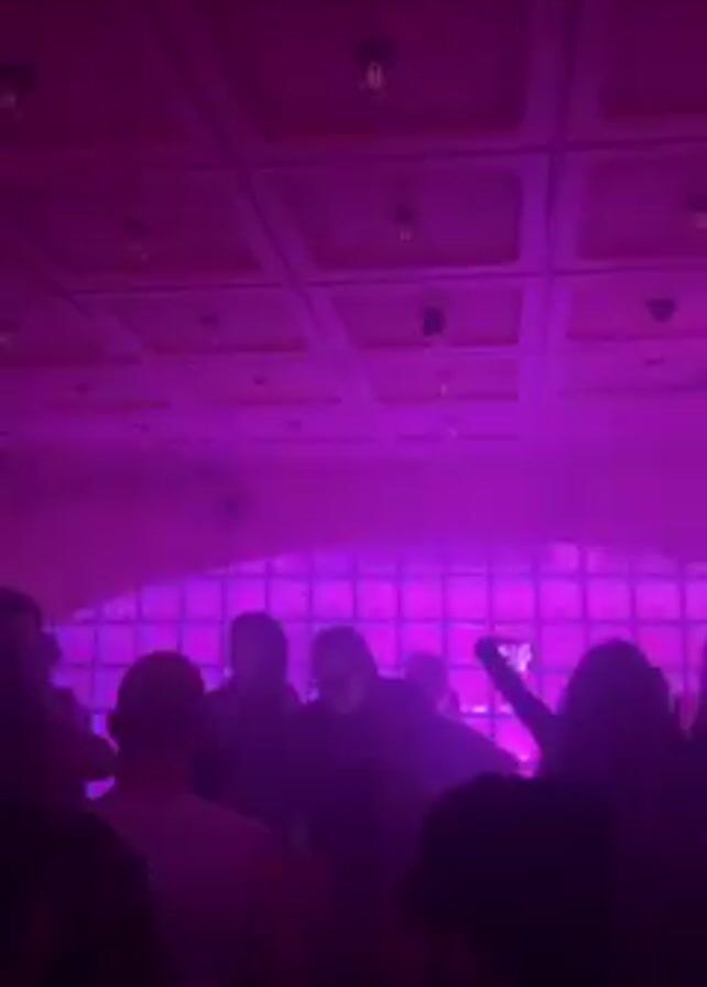 In a dimly lit space illuminated by a strong pink light, a crowd of silhouetted figures is gathered. The focus is on an individual with long hair, standing near the center, likely a DJ or performer due to their central positioning and the presence of a panel behind them. Some members of the audience are recording the event with their mobile phones. The environment appears to be an indoor venue with a unique ceiling design.