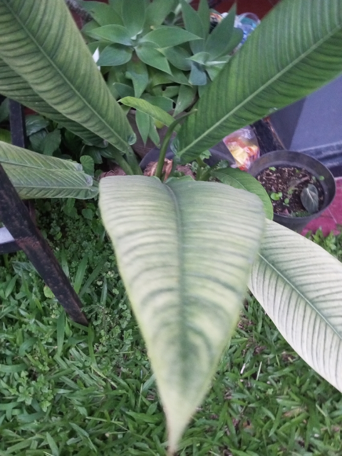 The image displays an outdoor scene in Ivato, Madagascar, primarily focused on various plant life. In the immediate foreground, a large, elongated light-green leaf with pronounced darker green horizontal striations and a central vein points towards the viewer, slightly out of focus. A similar leaf is partially visible to its right. The midground contains several other plants with broad green leaves, some exhibiting similar striations, others appearing solid green. A dark, vertical metal support structure or pole is present on the left. In the background, to the upper right, a dark cylindrical pot containing soil and a small, dark-leaved seedling is visible. Behind this, a blurred, multi-colored object, consistent with a plastic bag containing items, is present. A dark grey or black wall or facade forms the upper right background. The ground is covered by green grass interspersed with smaller, lighter green ground cover plants. No people or animals are depicted.