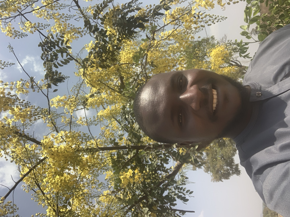 A smiling man is positioned against a backdrop of a tree filled with bright yellow flowers under a partly cloudy sky