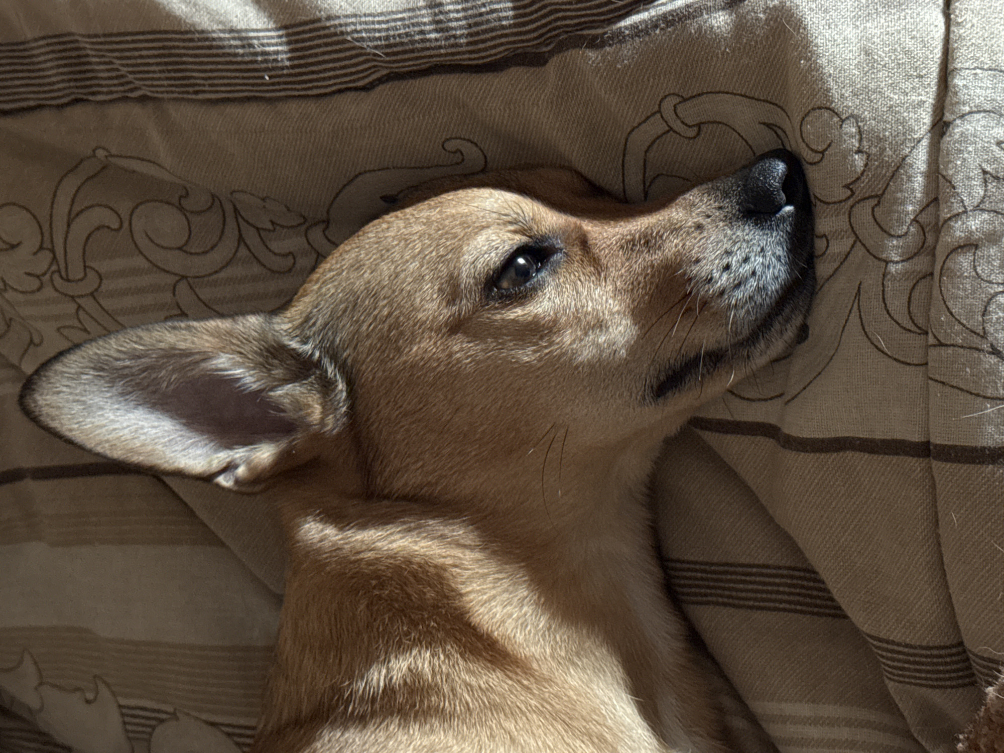 - "A brown dog is lying on a striped and patterned tan fabric" by FM-LLKcV2, licensed under CC BY 4.0