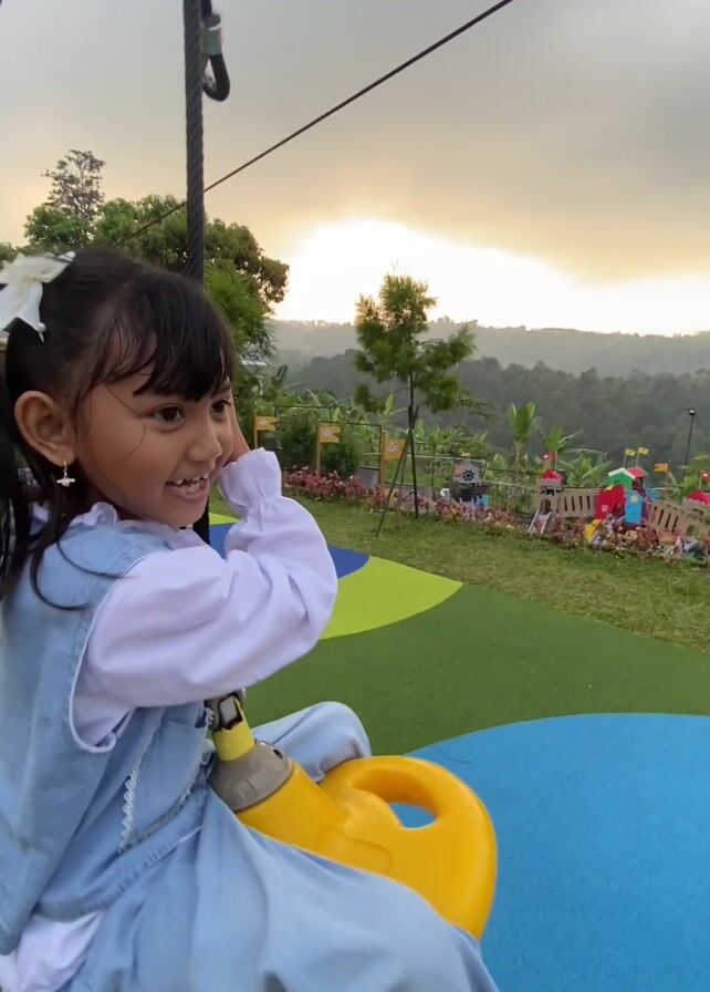 A young girl with dark hair and a white flower in her hair is sitting on a yellow swing that is suspended from a rope. She is wearing a white long-sleeve shirt under a light-wash denim vest and pants. The swing is on a blue and green padded surface in a park-like setting. In the background, there are trees, hills, and colorful playground equipment. The sky is cloudy, with a hint of sunlight breaking through. A hand reaches out to the swing, seemingly to push it. The girl smiles and looks around, appearing happy and engaged. She holds onto the rope. She laughs, looks at the camera, and holds up two fingers. Another child runs behind her.