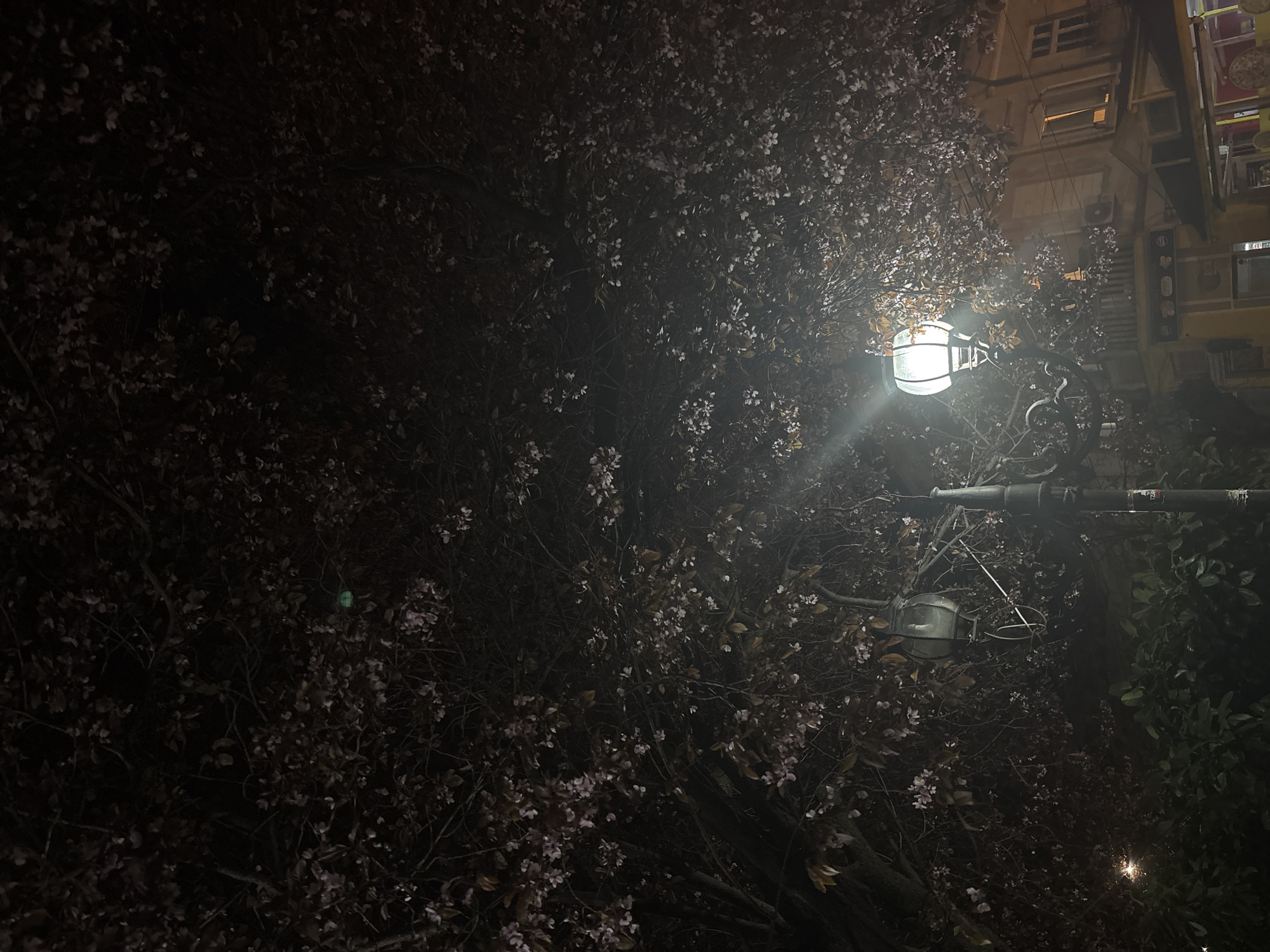 The image displays a nighttime urban scene in Petrich, Bulgaria. A prominent dark, ornate streetlamp, with a spherical enclosed fixture emitting a bright white light, is positioned in the lower-middle-right of the frame. Above and around the streetlamp, a large tree canopy is densely covered with numerous small, light-colored blossoms and some darker leaves, indicative of early bloom. To the right, in the background, a multi-story building with a yellowish-cream facade is partially visible. This structure features a balcony on its second level and multiple windows, some appearing open with interior illumination. Below the balcony, commercial storefronts with indistinct signage and glass fronts are discernible. Darker, dense green shrubbery occupies the lower-left portion of the frame. No individuals are present in the scene, and no specific actions or interactions are observed.