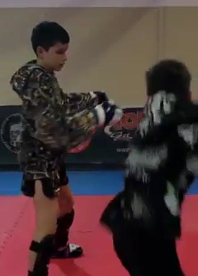 Two young boys engage in what appears to be sparring practice within a martial arts facility. The boy on the left wears a hooded sweatshirt with a camouflage-like pattern, along with black shorts and shin guards. The boy on the right wears a black hooded sweatshirt and pants. Both boys wear boxing gloves. They face each other on a red and blue padded floor. Background signage is partially visible.