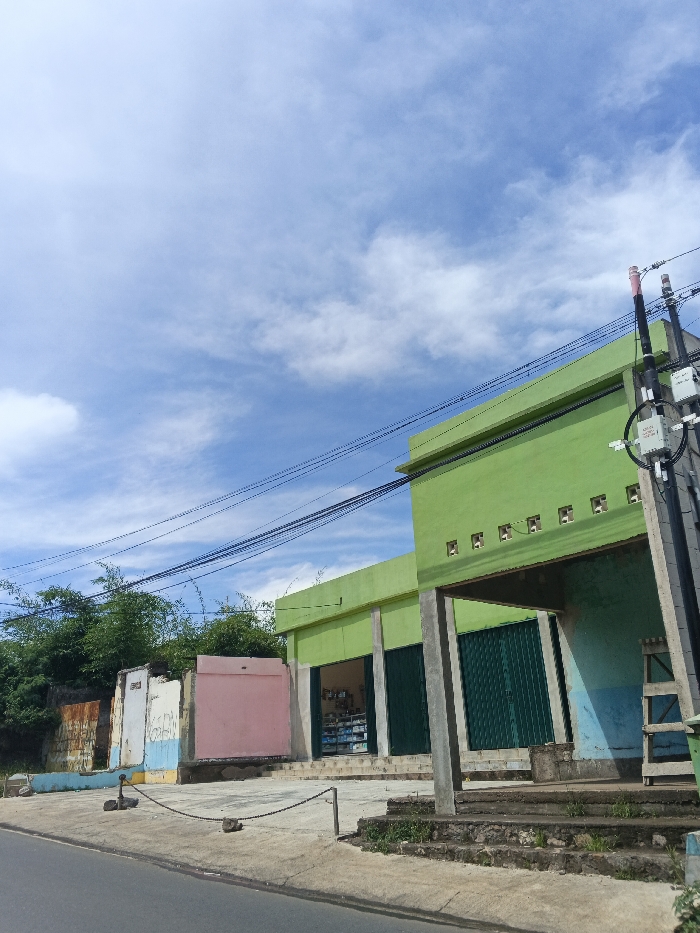 A vibrant, slightly tilted image captures a street scene with a mix of natural and built elements. The sky is expansive, filled with scattered clouds. Dominating the right is a green building with a covered entrance. To the left, a fragmented structure shows remnants of walls painted in white, blue, and pink, bordered by lush greenery. A concrete sidewalk runs along the street, marked by a chain-link barrier, while utility poles and wires stretch across the sky.