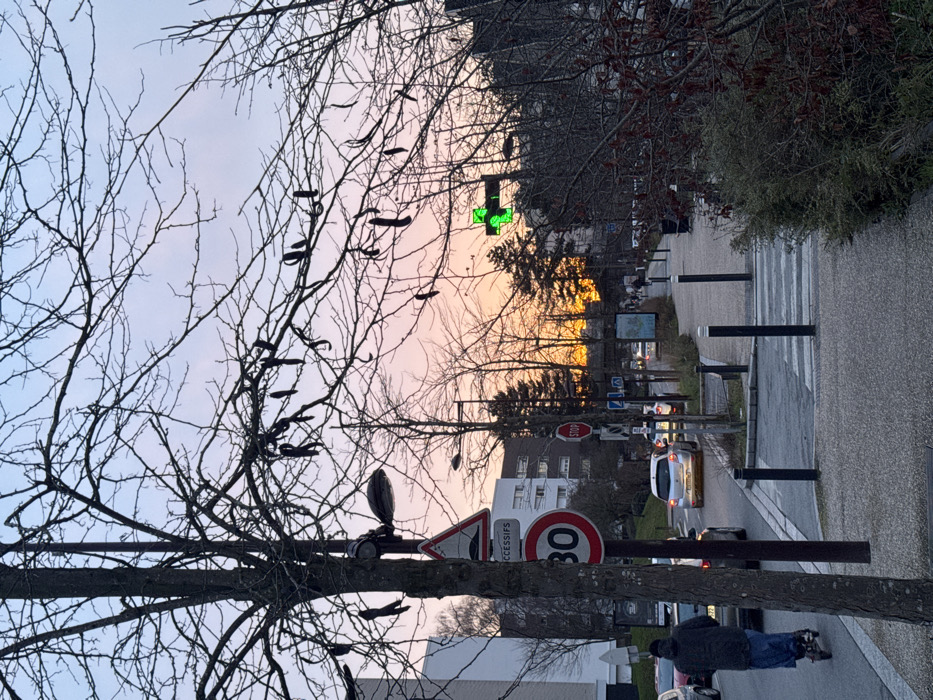 A street scene with a pedestrian walkway and cars moving along the road. A man stands near parked cars. Trees with bare branches frame the image, some featuring long, dark seed pods. A green cross pharmacy sign is visible in the distance amidst a sunset. Street signs, including a speed limit of 30, are posted along the roadside. The sky is a blend of blues, purples, and oranges.