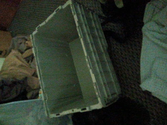 An open, light-colored plastic crate dominates the center of the frame, positioned on a dark textured surface. To the left, a stuffed animal sits next to another object, and to the right, a white object rests. The crate appears to be several stacked together, creating an enclosure. The overall image is somewhat dark and grainy.