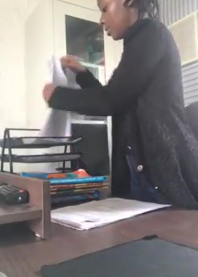 A woman stands at a desk in front of a white cabinet with a glass door, holding a stack of white papers. The papers are lifted from a desk tray, inspected, and then put back in the tray. The desk also holds a stack of books and a black pad.