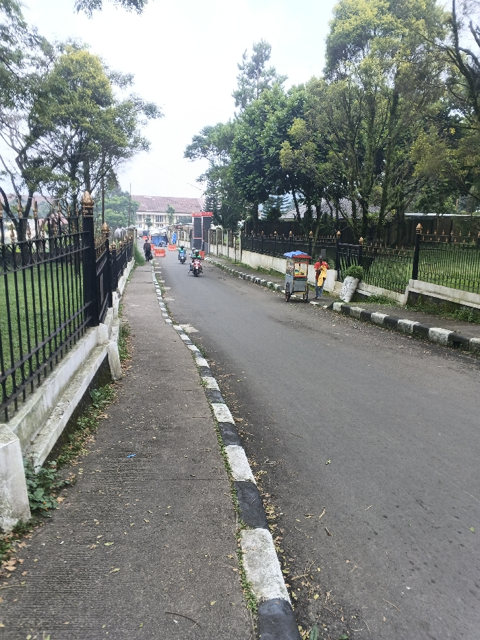 This image displays a street scene in the city of Candelaria, Philippines, looking down a paved asphalt road. The road is bordered by concrete sidewalks and black wrought-iron fences with decorative gold finials atop concrete posts on both sides. The road's curbs are painted with alternating black and white stripes. On the left, a concrete sidewalk runs parallel to a black wrought-iron fence, beyond which lies a manicured grassy area and mature trees. One individual is visible walking away from the camera on this sidewalk in the mid-ground. On the right side of the road, another black wrought-iron fence encloses an area with dense green foliage and trees. A mobile street food cart, featuring a blue umbrella and metal framework, is positioned near the curb. Two individuals are standing near this cart; one wears a yellow shirt and red shorts, while the other is partially obscured behind the cart. A white sack rests on the ground next to the cart. Multiple motorcycles are present on the asphalt road, heading away from the viewer. One motorcycle appears to be a three-wheeled variant or a motorcycle with a sidecar. Further down the street, orange and white traffic barriers are visible, leading towards a multi-story building with a red-colored roof section in the background. The scene is illuminated by an overcast sky, casting soft light on the abundant green trees lining the street.